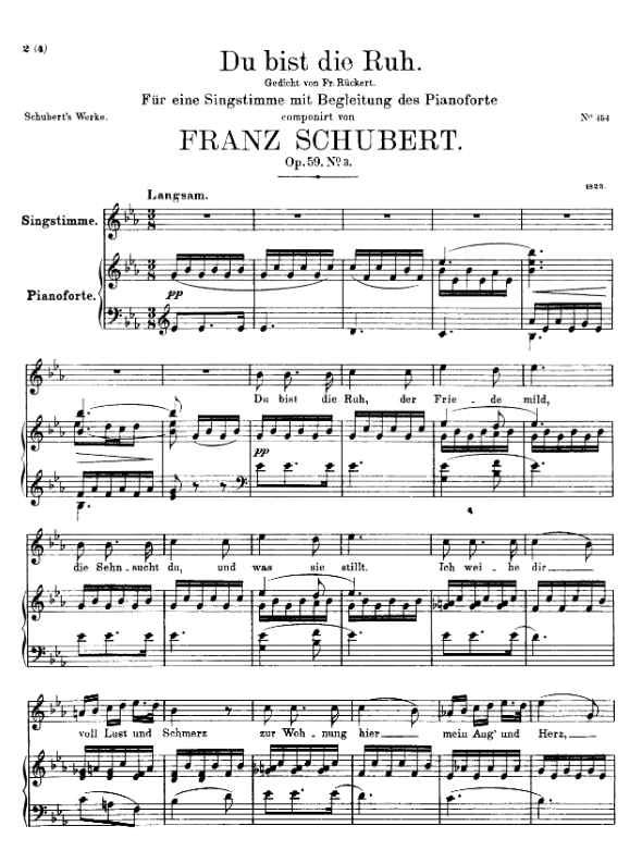 Das Lied beginnt mit bewegten Sechzehnteln im Dreiertakt. Es umkreist in der Klaviereinleitung Es-Dur. Schon die erste Strophe spricht das Sehnsuchtssubjekt «Du» an und verbindet es mit Ruh, Frieden und Stillen der Sehnsucht, indem eine schlichte Liedmelodie pianissimo und in der Tempobezeichnung larghetto (ziemlich langsam) stufenweis aufwärtssteigt und nach den ersten vier Takten gleich nochmals wiederholt wird. Das Klavier trägt mit seinem immergleichen tiefen Ton C zur Grundstimmung «Ruhe» bei.